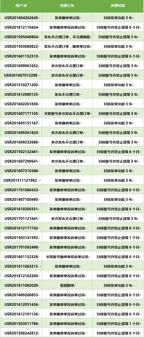 现将近期(2017年1月9日-2017年1月16日)违反平台规定,扰乱交易秩序的部分用户进行公示。
